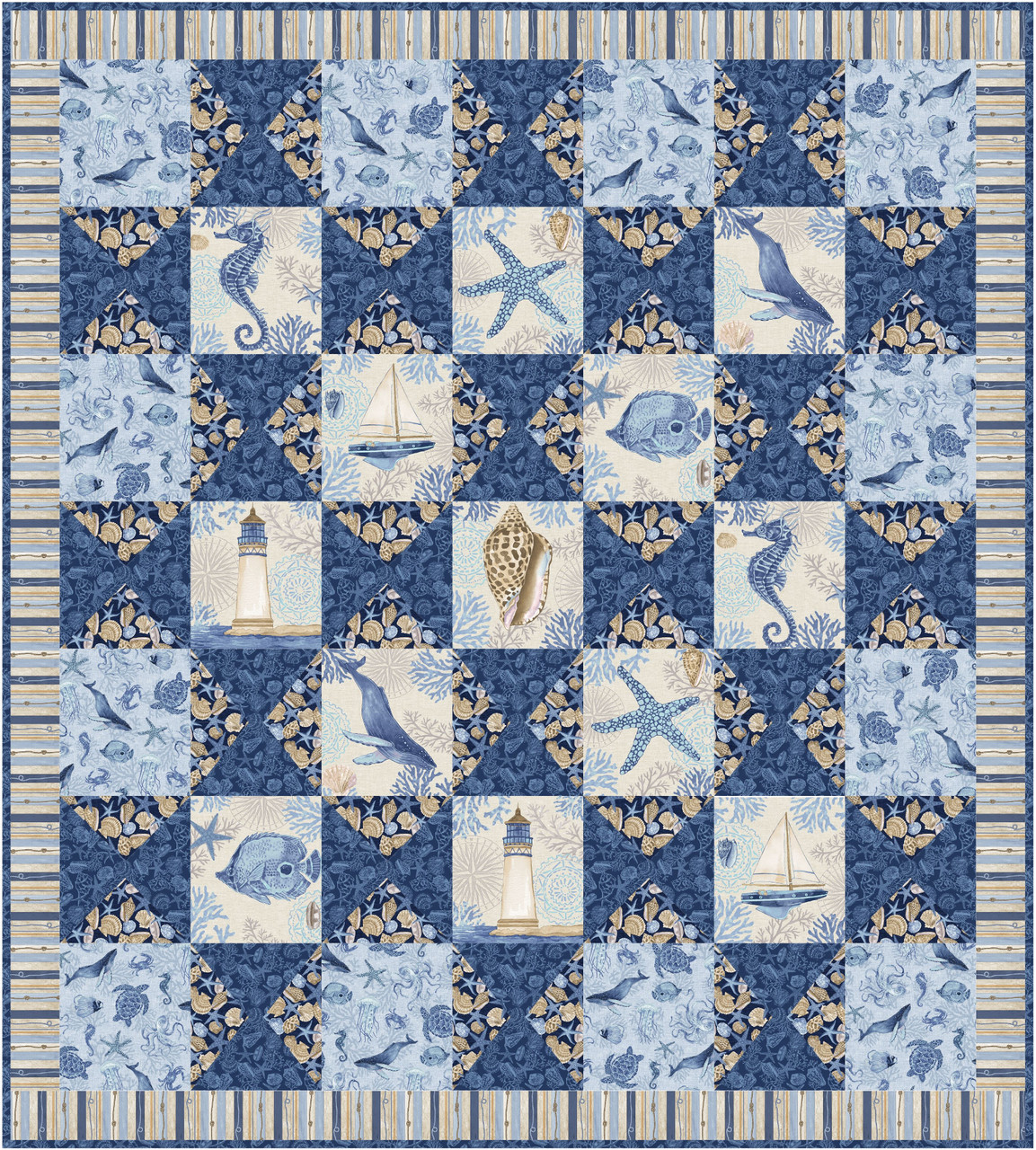 This quilt uses small panels and alternates them with quarter square triangles - the thing to note is that the QST's have been trimmed to match the panels once they are made so that they become rectangular, another reminder that you can always do the same. The "panels" do not have to be a panel print either, fussy cutting a large scale print would also work.